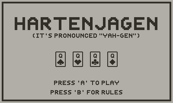 A variation on the popular card game Hearts, literally translated from Dutch as "Chasing/Hunting Hearts". Compete against 3 AI opponents in a classic trick-taking card game to win the fewest Hearts and Queens and be declared the winner. To advance the game, press the A button. The game rules (also accessible from within the game) are as follows: